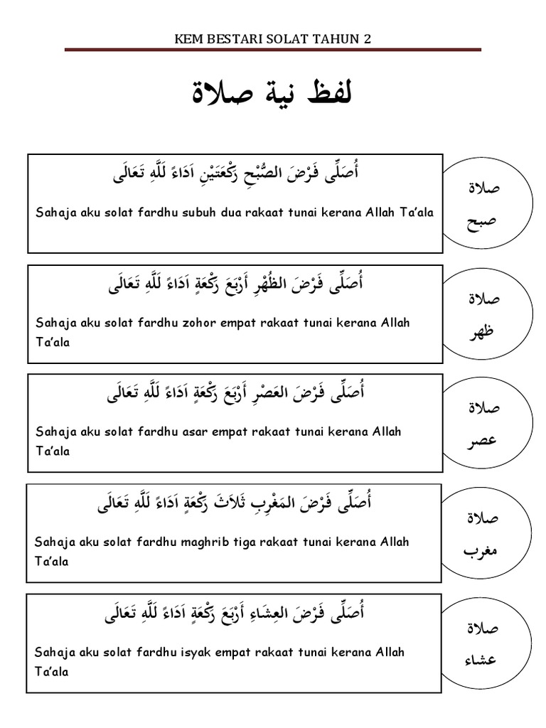 Sahaja aku solat fardu subuh dua rakaat tunai kerana Allah Taala. اصلى فرض العصراربع ركعات اداء لله تعالى مأموما لله تعالى Sahaja aku sembahyang fardhu asar empat rakaat tunai kerana Allah Taala. Panduan Solat Fardhu is the compulsory daily prayers guide for Muslim.