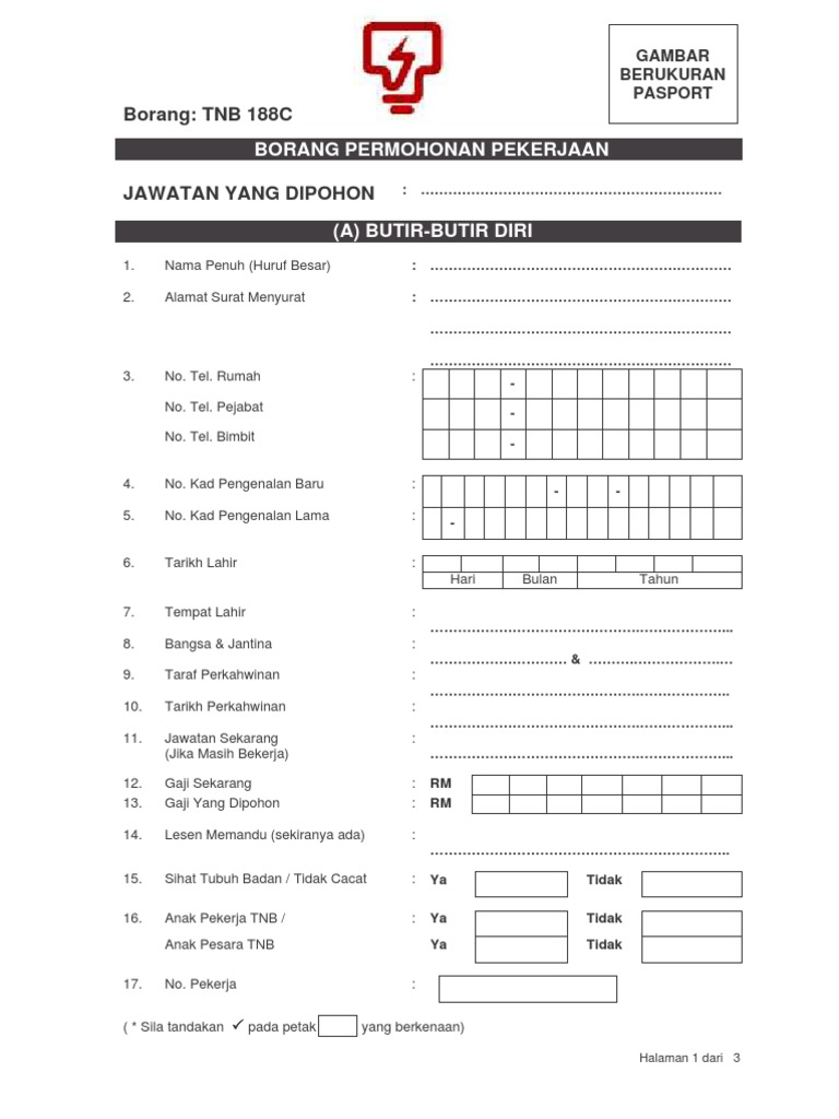 Type draw or upload an image of your handwritten signature and place it where you need it. Tnb 188c b pengalaman kerja jawatan firma syarikat dari tempoh hingga c kelulusan akademik kelulusan pangkat cgpa tahun bidang gred matapelajaran bmelayu binggeris. Borang permohonan kerja adalah berguna jika anda mendapat permintaan buta dari pencari kerja seperti melalui e-mel dan ingin memberi mereka borang permohonan pekerjaan untuk.